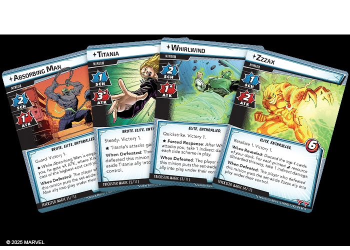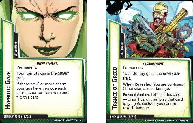 So how do these work in the game. First of all you have to take on the Enchantress, wh will hit you with a hypnotic gaze. There are five different hypnotic gaze cards each with a different enchantment on the opposite side, get too many charm counters and the card gets flipped to its unique “trance” side and gives you the Enthralled trait which has an immediate effect and also causes you to take a forced action. For example you might be confused or take damage and also forced to draw a card and play it. Also being enthralled will make side schemes nastier to deal with.